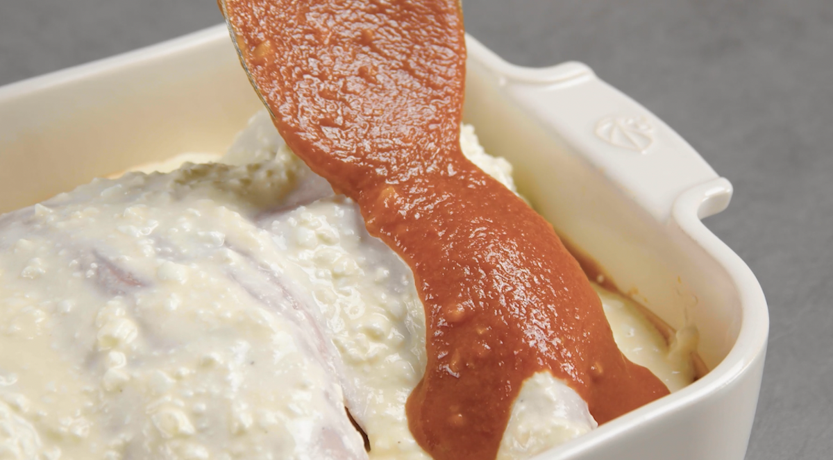 7. Daraufhin kommt erneut eine Schicht Tomatensoße, die anderen 3 Hähnchenbrüste, 3 Scheiben Kochschinken, Ricottacreme und noch eine Schicht Tomatensoße.