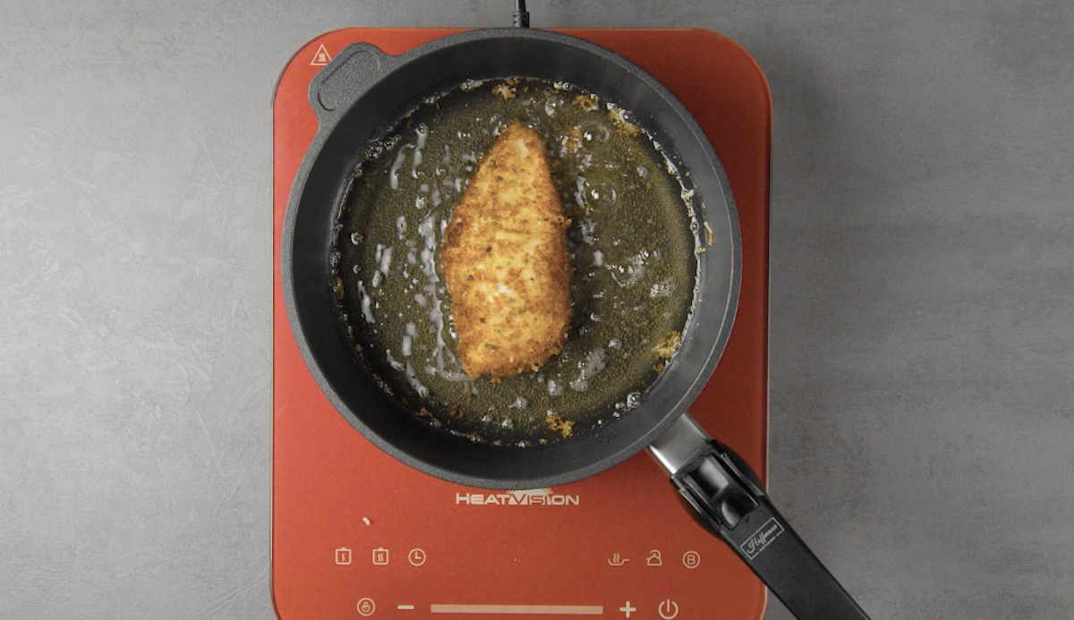 4. Paniere die gefüllten Hähnchenbrüste (zuerst in Mehl, dann in Ei und dann in einer Paniermehl-Oregano-Parmesan-Mischung). Brate die Hähnchenbrüste in Sonnenblumenöl an (von beiden Seiten jeweils 4 Minuten), bis sie goldbraun sind.