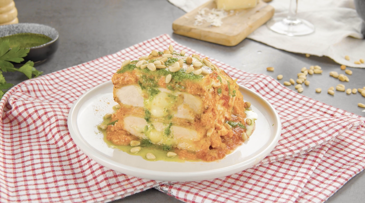 Serviere den Hähnchenauflauf mit grünem Pesto und gerösteten Pinienkernen. Wow, dieses Rezept ist einfach das absolute Verwöhnprogramm für deine Geschmacksknospen! Mit Mozzarella gefüllte Hähnchenbrust, würzige Tomatensoße, Ricottacreme, Kochschinken und Ziegenkäse – was fehlt hier noch zum perfekten Glück? Eine hungrige Familie, genau. Guten Appetit!
