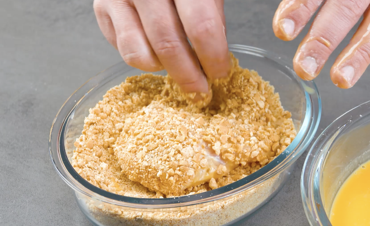 3. Stelle nun die Panade her. Zerkleinere die Butterkekse und gib Paprikapulver, Zwiebelpulver, Pfeffer, Knoblauchpulver sowie Salz hinzu und vermenge alles miteinander. Ziehe die Hähnchenbrüste erst durch Mehl, dann durch verquirltes Ei und dann durch die knusprige Panade.