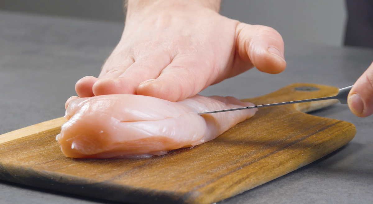 2. Salze und pfeffere die Hähnchenbrüste und schneide an der Seite jeweils einen großen Schnitt hinein.