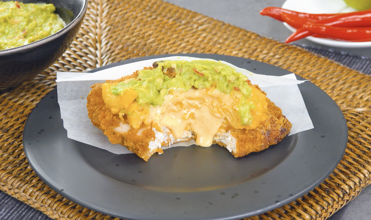 Mac and Cheese trifft auf Geflügel! Gefüllte und knusprig panierte Hähnchenbrust mit Käse-Makkaroni. Dazu gibt es eine würzige Guacamole. Geniale Interpretation des beliebten US-Klassikers.