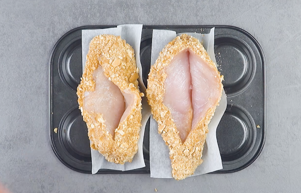 4. Drehe eine Muffinform um und lege 2 Stück Backpapier zwischen die Mulden. Lege die Hähnchenbrüste darauf und ziehe sie jeweils am Einschnitt auseinander.