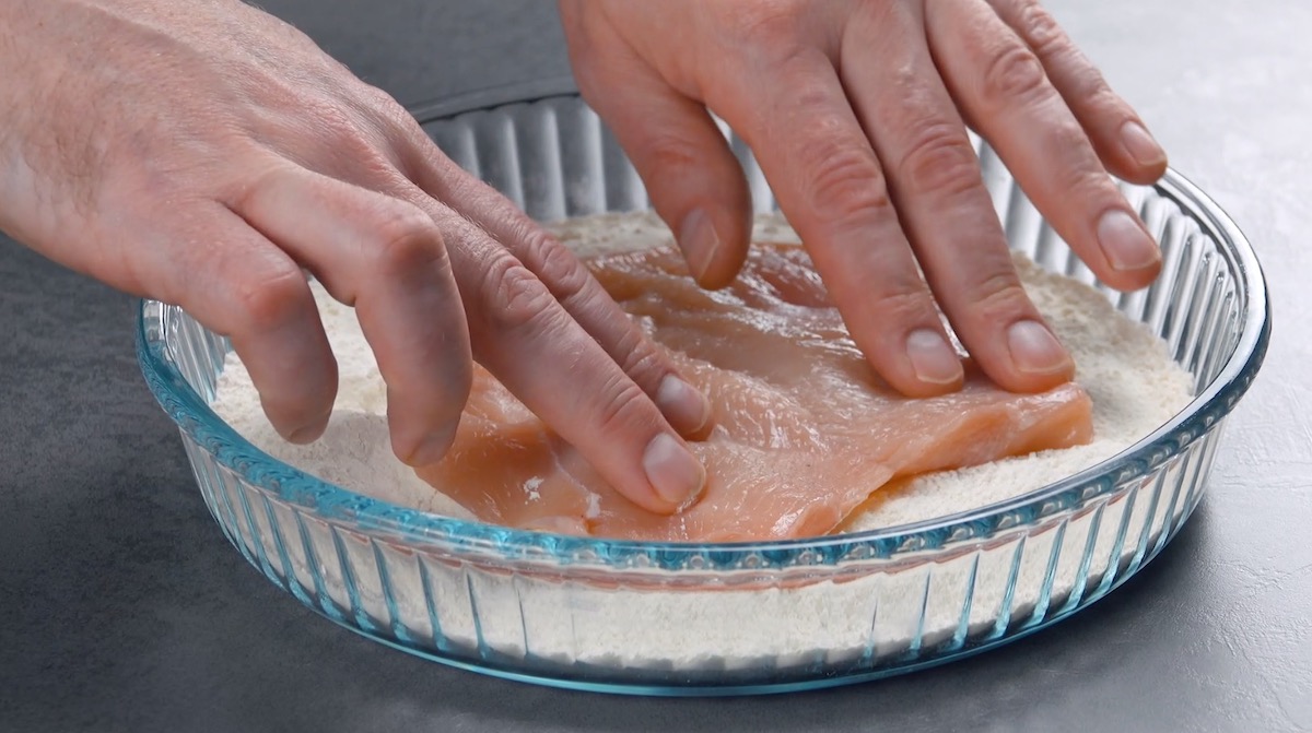2. Bedecke das Hähnchen von beiden Seiten mit Mehl.
