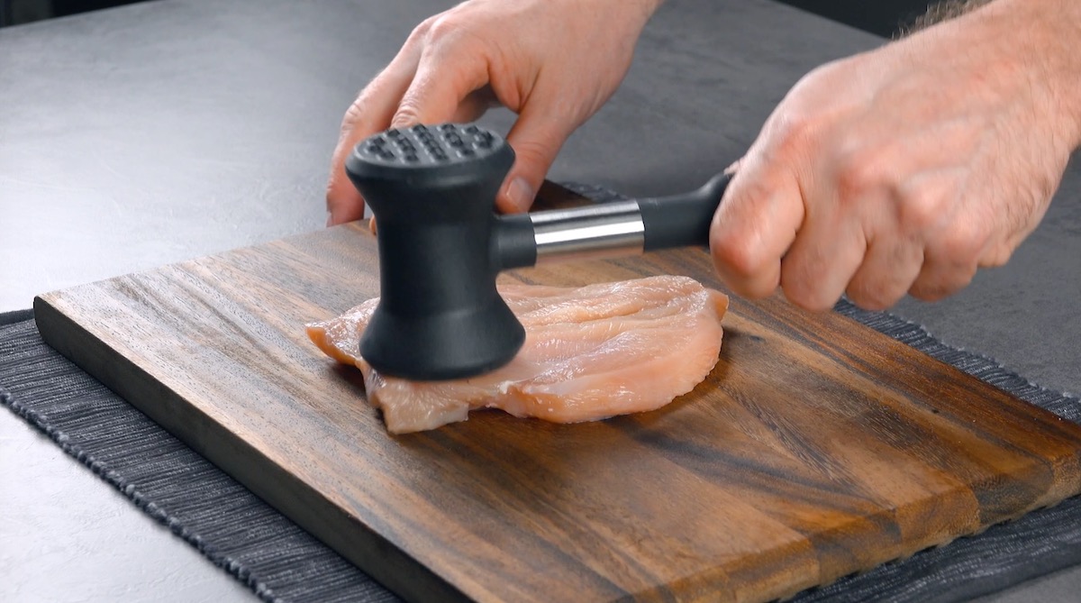 1. Schneide das Hähnchen mit einem Schmetterlingsschnitt auf und plattiere es.