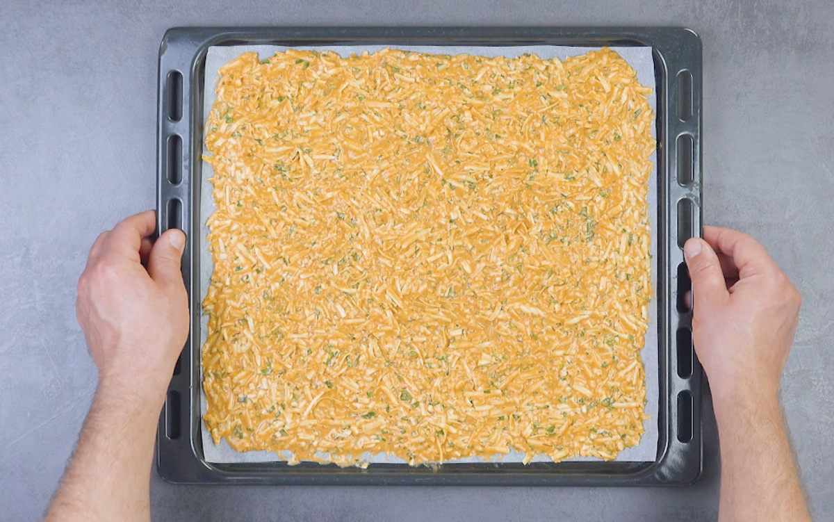 2. Verteile die Masse gleichmäßig auf ein mit Backpapier ausgelegtes Backblech und schiebe dieses bei 170 °C Umluft für 20 Minuten in den Ofen.