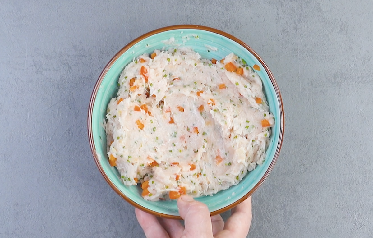 4. Vermische die kleingehäckselte Masse mit Paprikawürfeln und Schnittlauch.