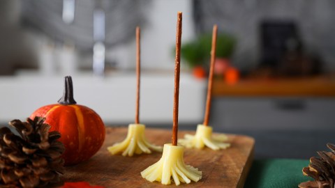 - Halbiere die Käsesticks und forme mit einem Messer einzelne Borsten wie für einen Besen aus ihnen.