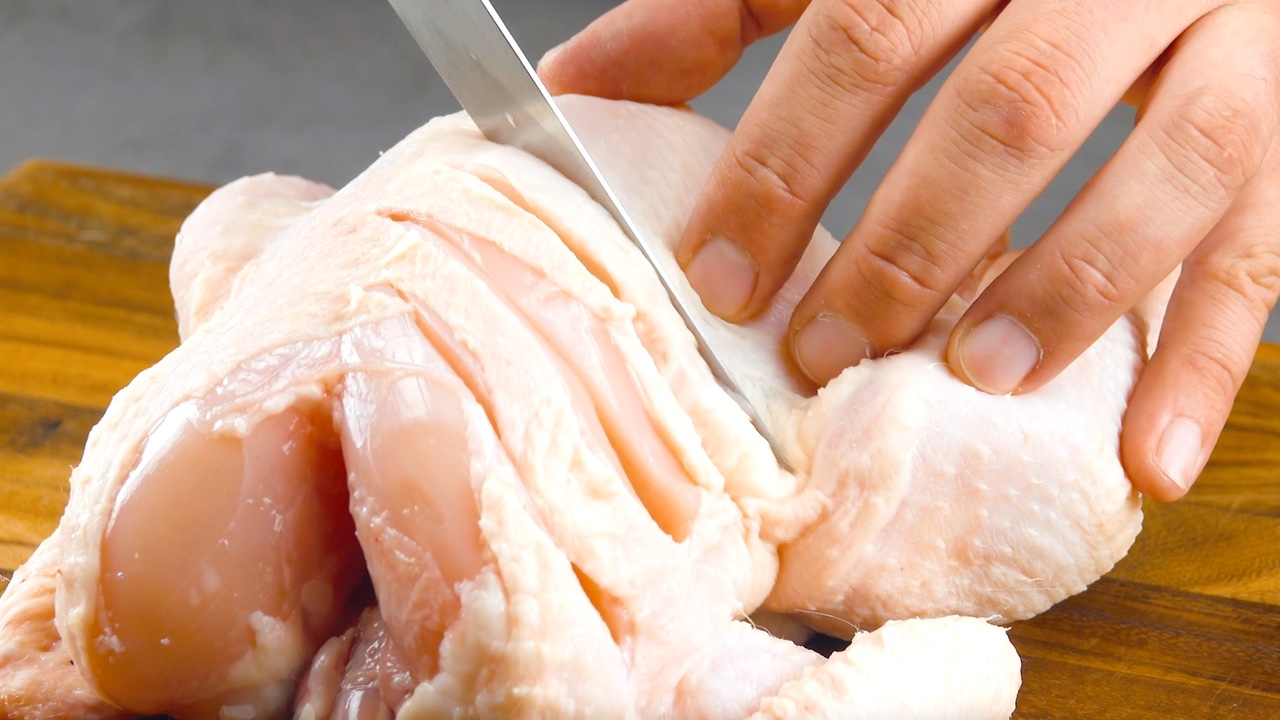 1. Beginne damit, das Huhn ringsherum mit einem Messer einzuschneiden. Starte an der Brust und schneide auch die Keulen ein.
