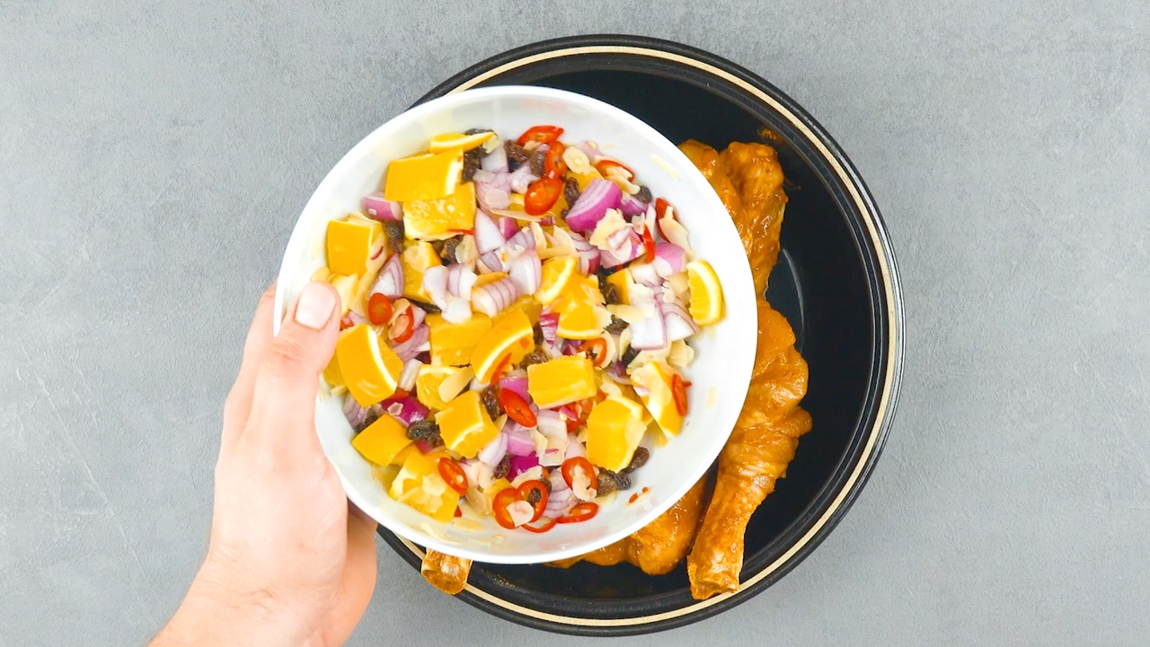 4. Nutze die Zeit am besten gleich, um die Füllung für das Hühnchen herzustellen. Schneide die Chilischote, die Zwiebel und die Orange dafür klein und gib sie zusammen mit den Mandeln und Rosinen in eine Schüssel. Vermenge alles gut miteinander.