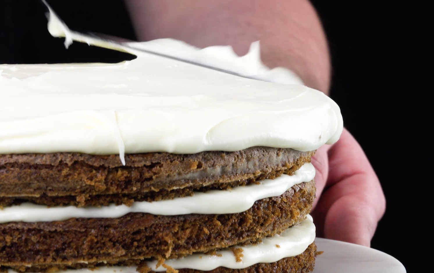 6.) Nun wird das Kunstwerk zusammengesetzt: Gib dafür den ersten Boden auf eine Kuchenplatte und verteile einige Esslöffel Creme darauf. Setze den zweiten Boden darauf, verstreiche auch darauf ein paar Esslöffel Creme und deckele dies mit dem letzten Boden. Verteile nun den Rest der Creme auf der dreistöckigen Konstruktion und um den ganzen Kuchen herum.
