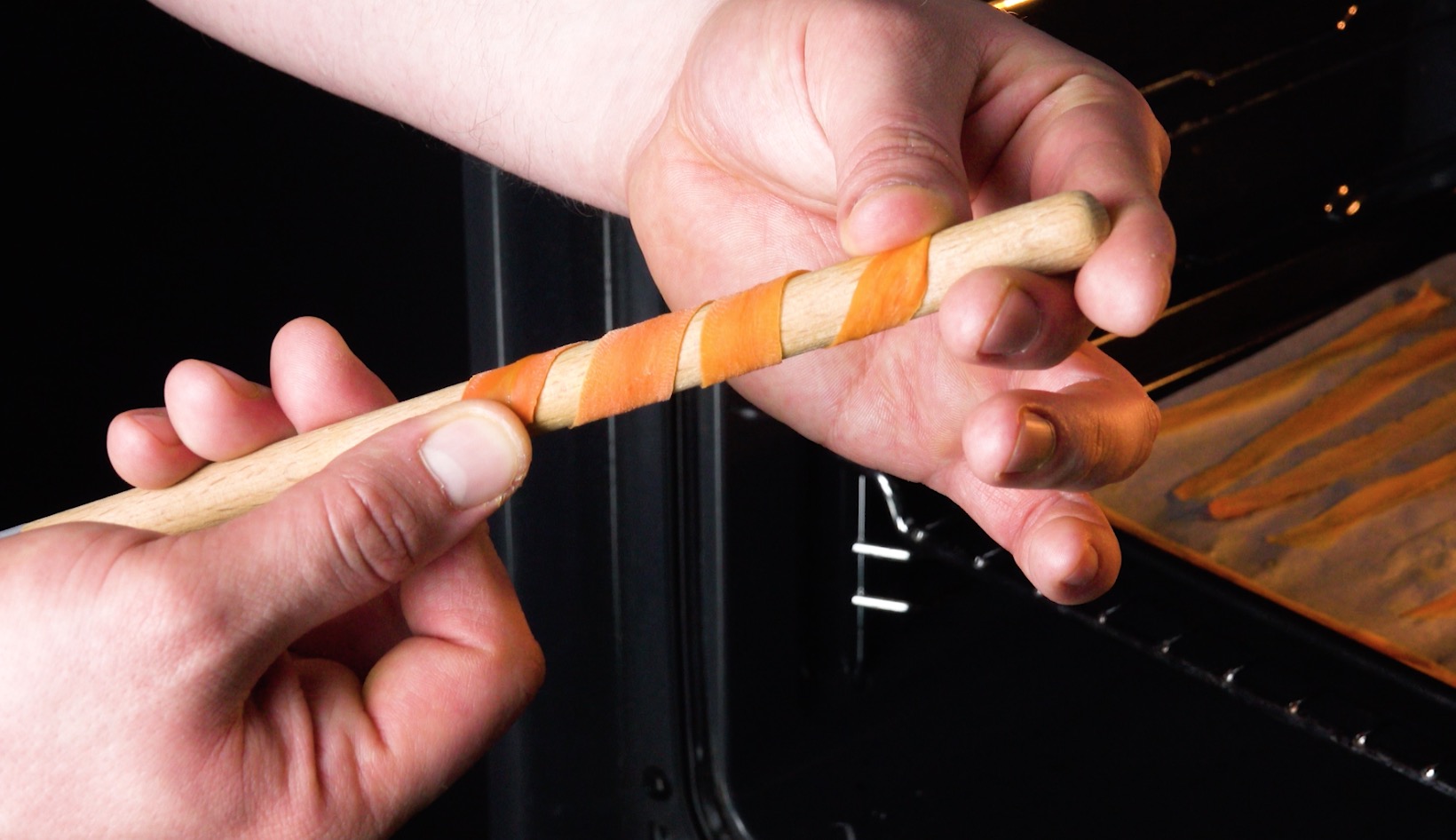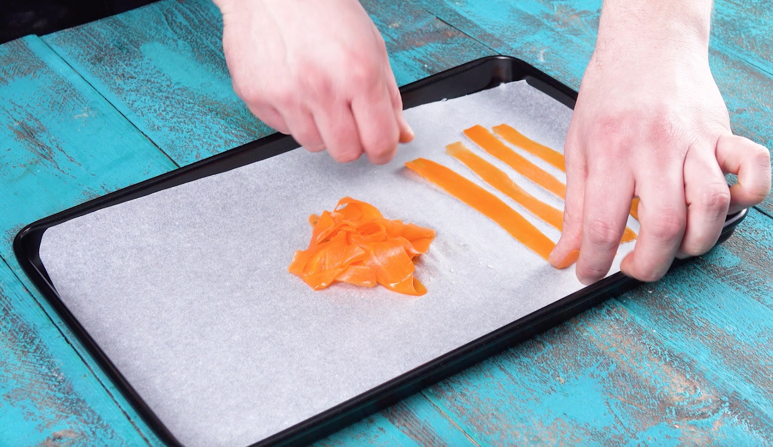 3.) Schäle nun Streifen von einer Möhre ab, bis etwa die Hälfte davon abgeschält ist. Lass dann Wasser und Zucker zusammen aufkochen, gib die Karotten in den Sirup und blanchiere sie für 1 Minute darin. Schöpfe sie dann ab und lege sie nebeneinander auf ein mit Backpapier ausgelegtes Backblech. Lass die Streifen für 20 Minuten bei 100 °C bei Ober-und-Unterhitze trocknen.