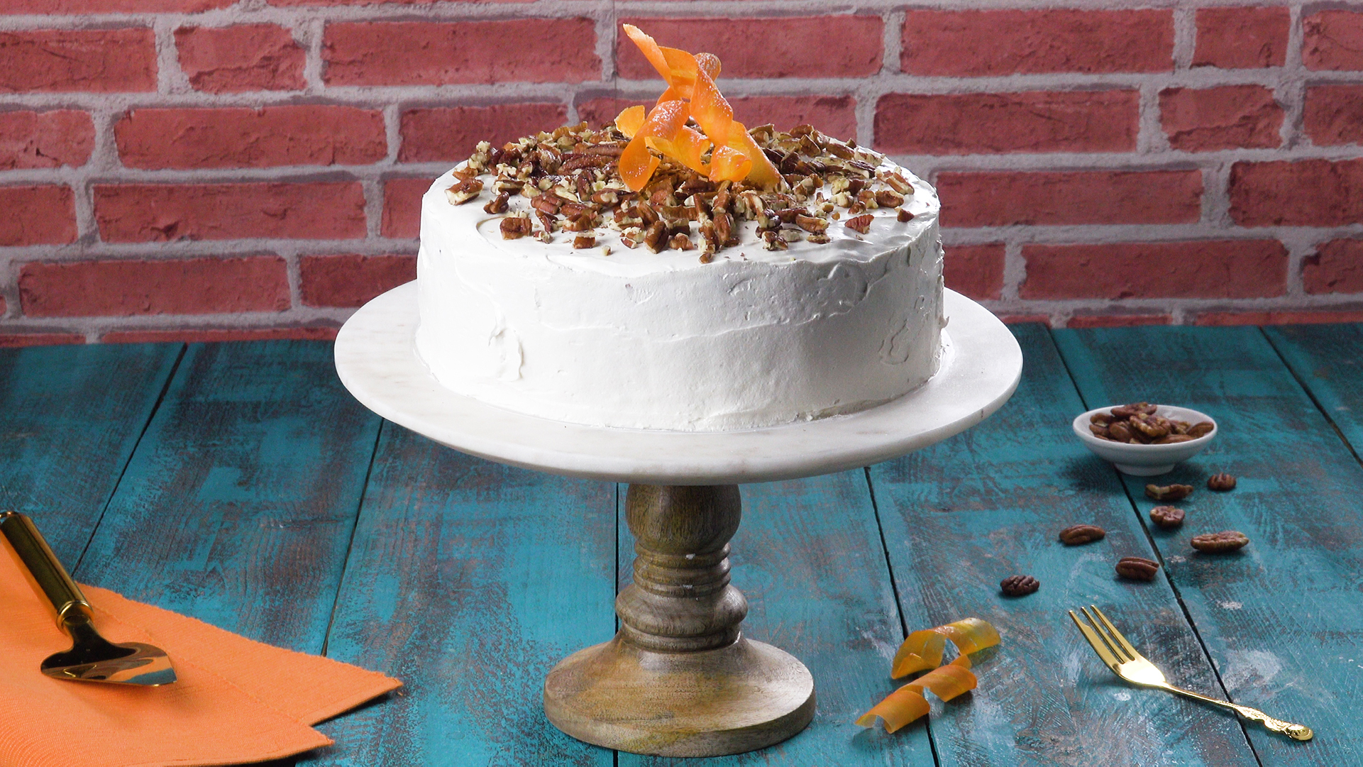 7.) Als Dekor streust du zuerst noch nach Belieben Pekannüsse auf den Kuchen und legst dann als besonderen Blickfang einige geringelte Karottenstreifen auf die Mitte des Deckels.