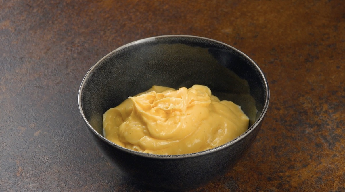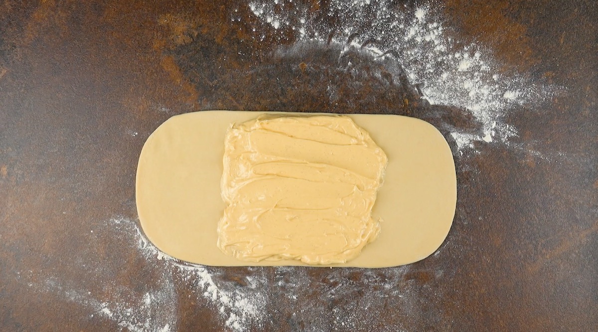 4. Verteile den Vanillepudding mittig auf einer quadratischen Fläche auf dem Hefeteig.