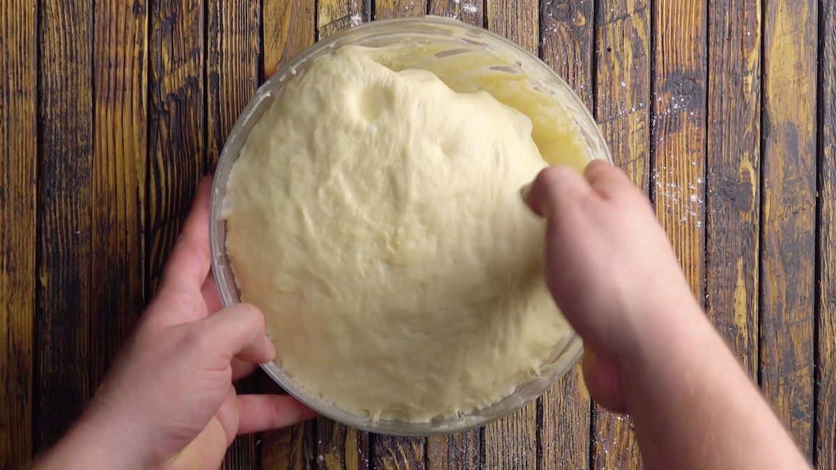 Sowohl für die Apfel- als auch für die Nuss-Variante brauchst du je einen Hefeteig. Verknete dafür Wasser, Hefe, Eier, Zucker, Salz, Öl und Mehl miteinander und lass den Teig für etwa eine halbe Stunde zugedeckt gehen, bis er deutlich an Größe zugenommen hat.