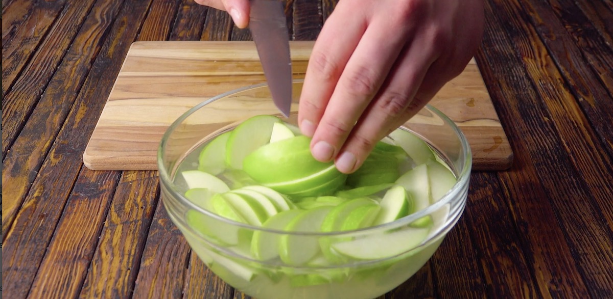 1.1) Schneide zwei Äpfel in dünne Scheiben und lege sie ein paar Minuten in einer Schale mit Zitronenwasser ein.