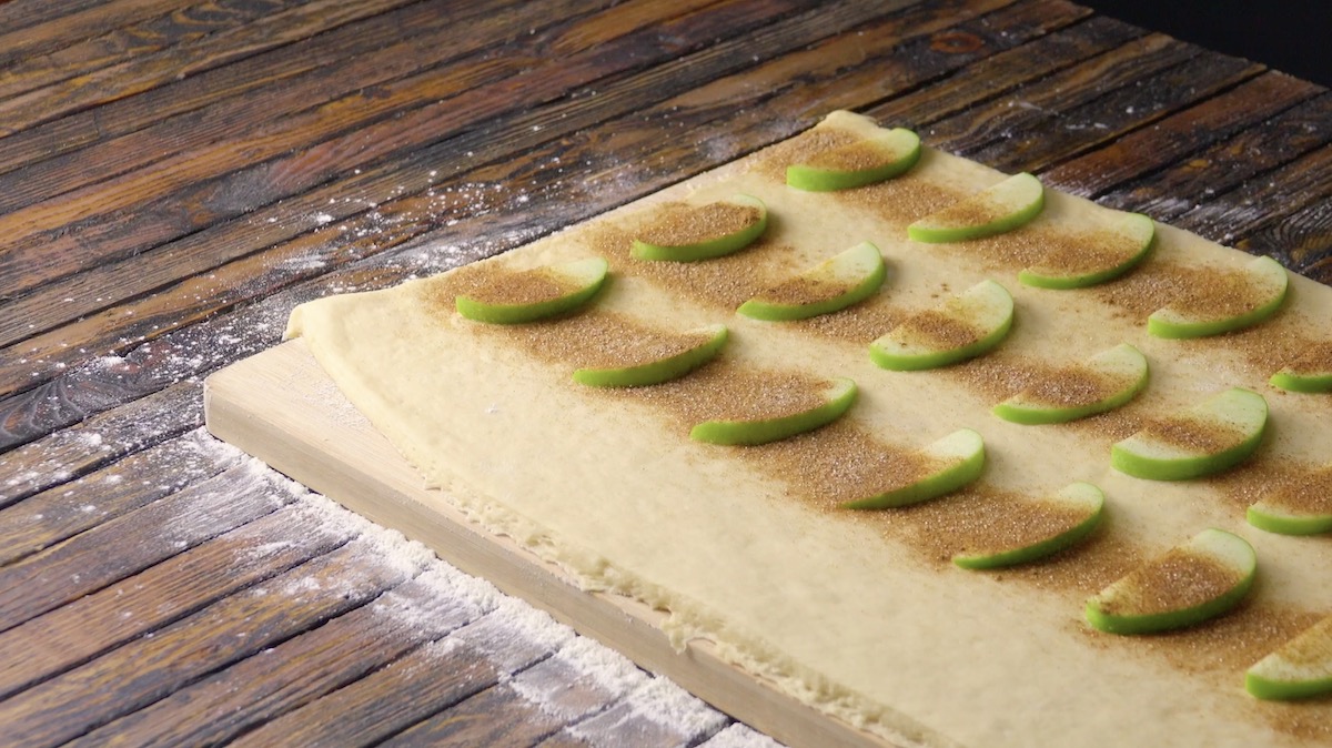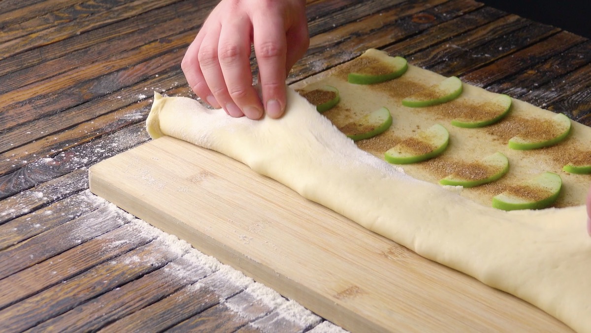 1.3) Lege nun den breiten Teigrand auf die erste Apfelreihe und schlage den Teig dann wieder auf die nächste Apfelreihe, bis du eine Teigrolle hast.