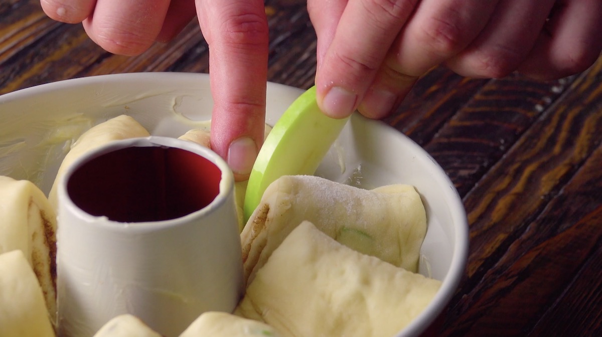 1.5) Lege die Stücke jetzt in eine eingefettete Gugelhupfform. Schiebe in jeden Zwischenraum eine Apfelscheibe und bestreiche alles mit einem verquirlten Ei.