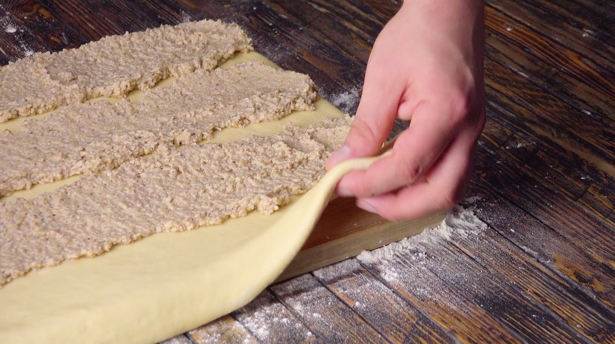 2.1) Vermische die gemahlenen Walnüsse mit Sahne, Zucker und Zimt. Verteile die Masse ebenfalls in drei Reihen auf dem Hefeteig und rolle auch diesen ein.