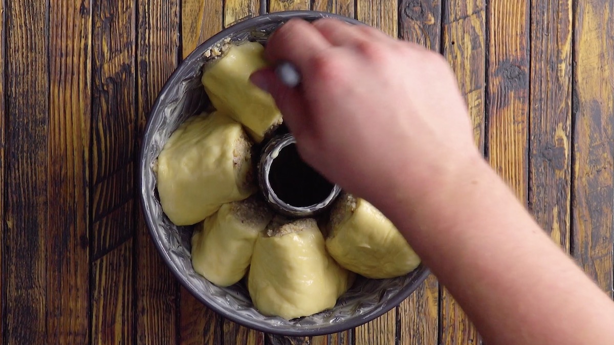 2.3) Lege auch diese Teigstücke in eine eingefettete Gugelhupfform und bestreiche sie mit einem verquirlten Ei.