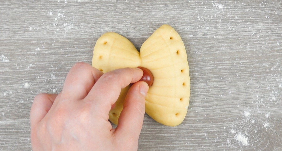 1.5 Verziere den soeben entstandenen Schmetterling, indem du mit Essstäbchen vorsichtig Punkte in den Teig drückst. Dekoriere den Hefeteig in der Mitte zudem mit einer Kirsche.