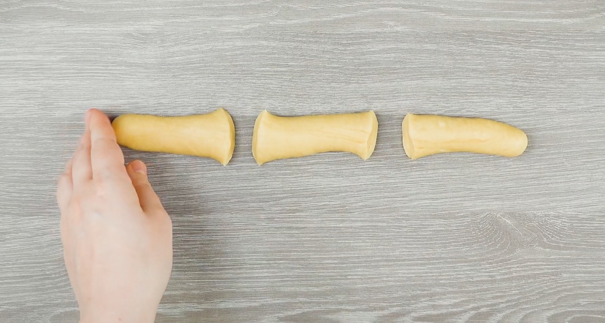3.1 Forme den Hefeteig zu einer Rolle und schneide diese in drei gleich große Teile.