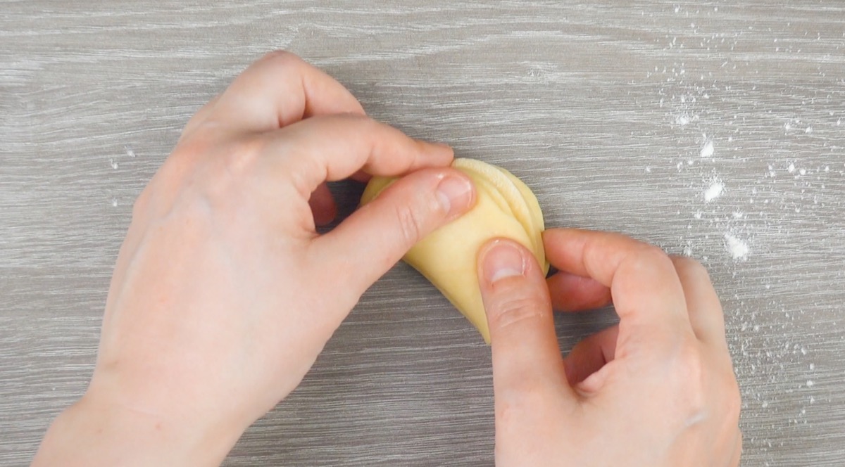 5.2 Rolle dann den Teig, der sich zwischen den zwei Einschnitten befindet, nach unten hin ein.