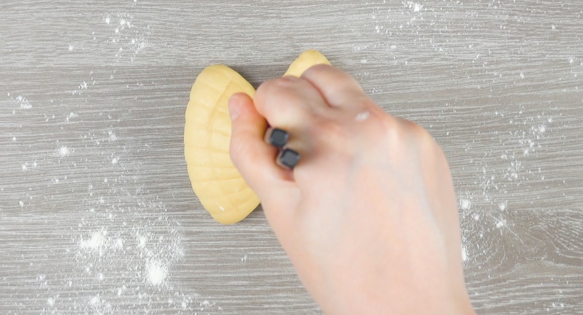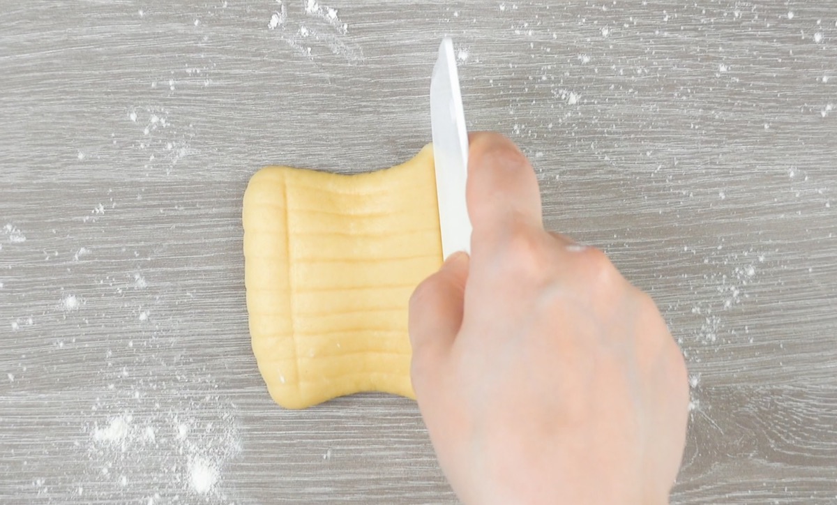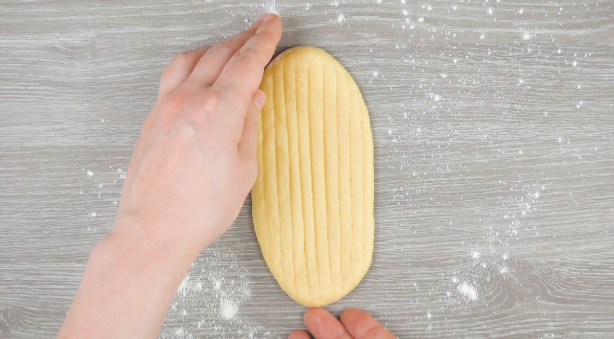 1.1 Rolle etwas Hefeteig in eine ovale Form und drücke mit dem Teigschaber der Länge nach Streifen in den Teig.