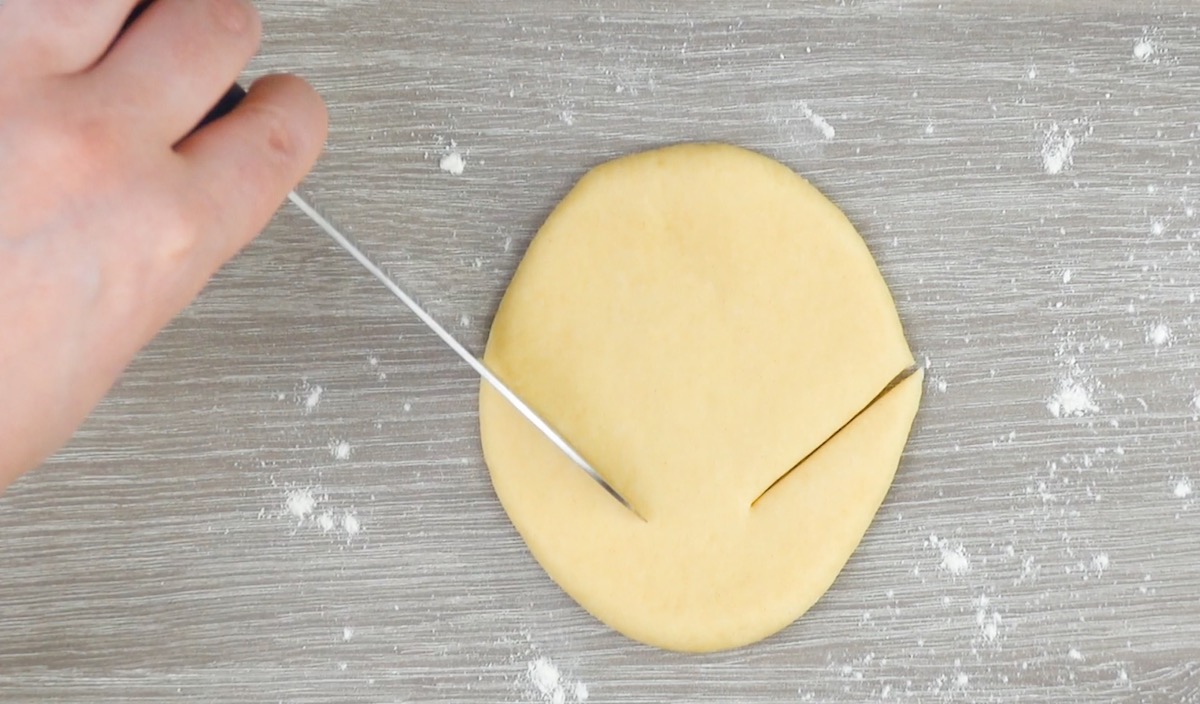 5.1 Rolle den Hefeteig oval aus und schneide ihn mit einem Messer zweimal schräg ein.