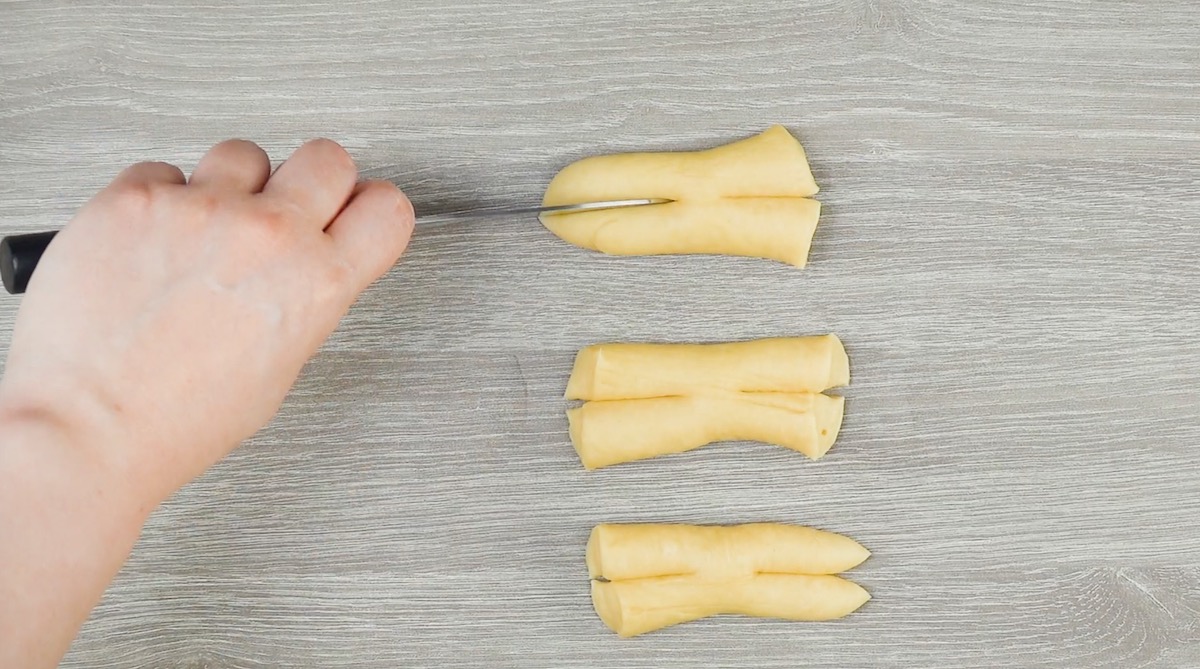 3.2 Schneide die Hefeteigstücke jeweils an beiden Seiten der Länge nach ein.