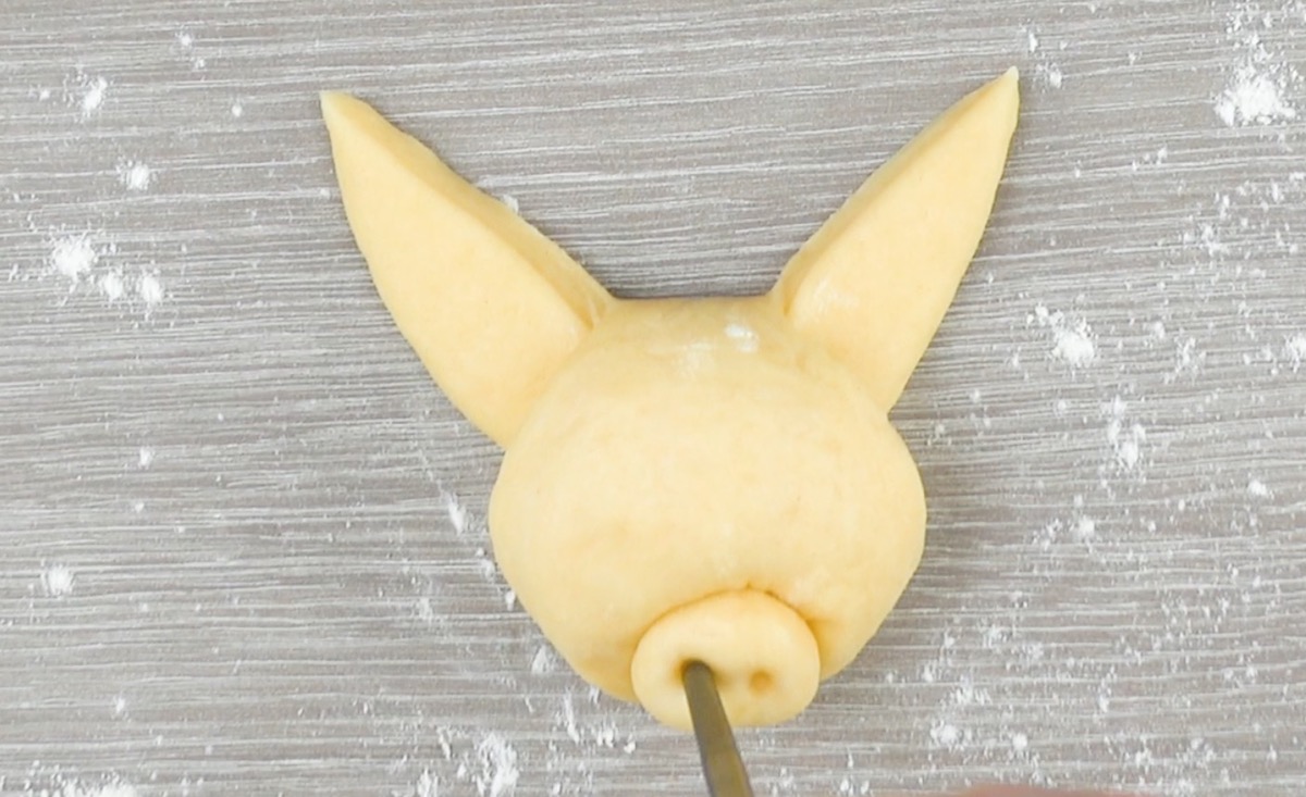 5.4 Forme eine kleine Teigkugel und drücke diese auf das Loch. Verpasse ihr mit einem Essstäbchen zwei kleine Schweinenasenlöcher.