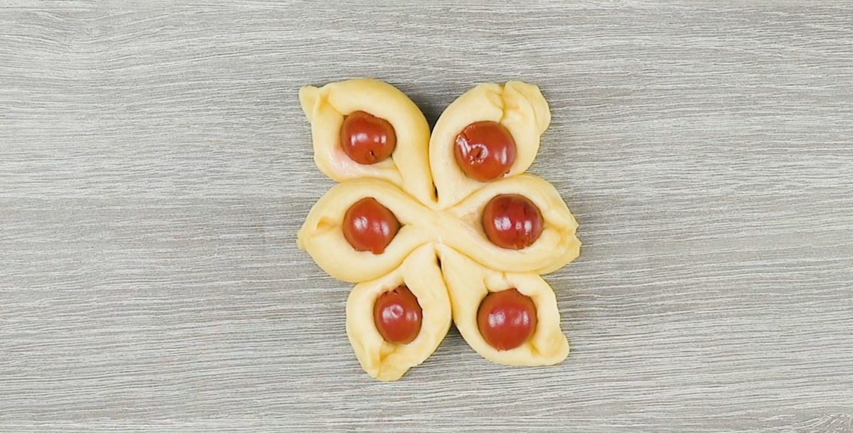 3.3. Spreize die Hefeteige an den Schnittstellen, lege eine Kirsche in den Zwischenraum und drücke die Enden wieder zusammen.