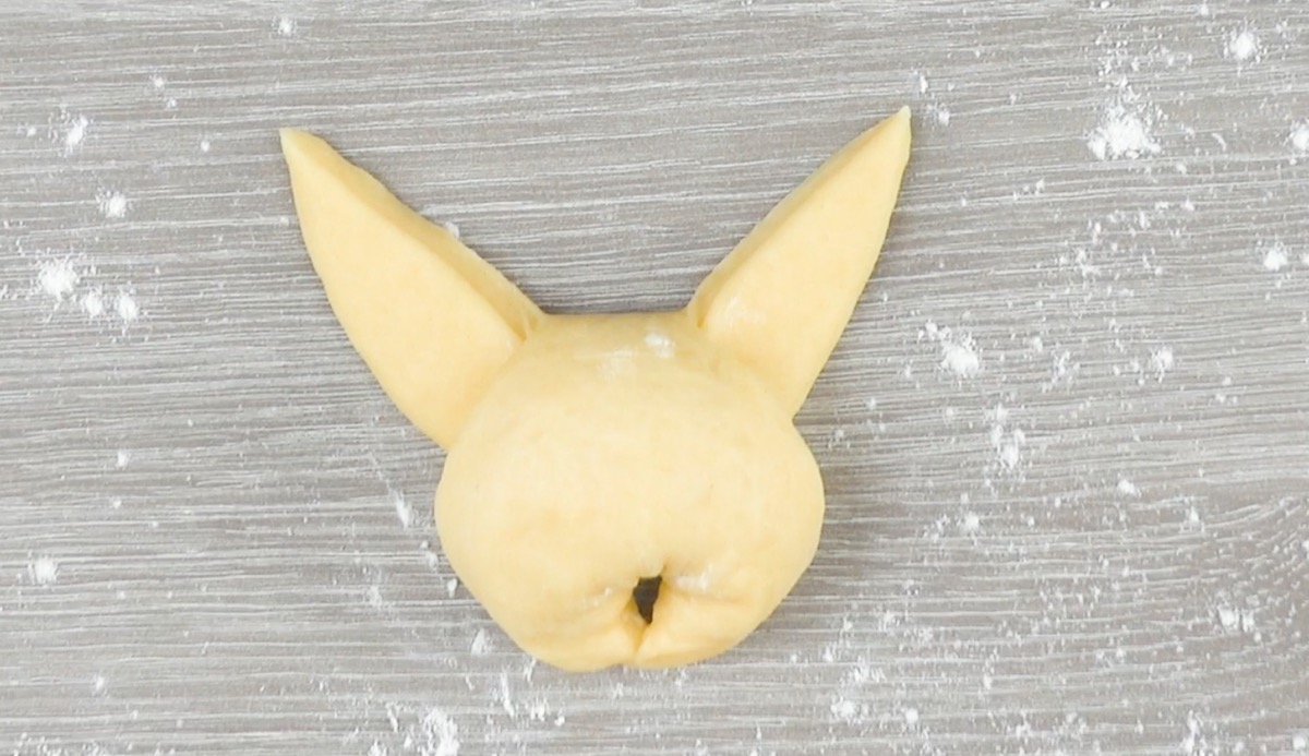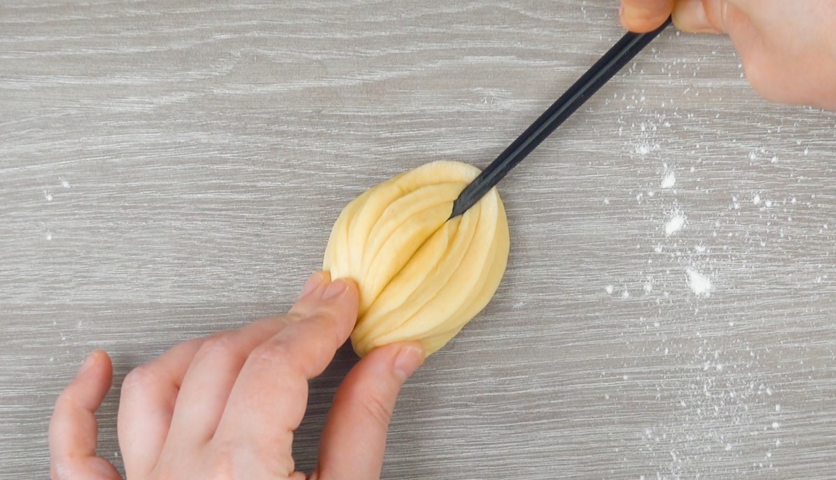 2.3 Drücke erneut mit einem Essstäbchen auf den Hefeteig und drücke die Enden des Teiges zusammen.