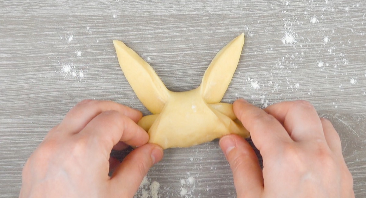 1.4 Raffe den Hefeteig in der Mitte mithilfe von Essstäbchen zusammen.