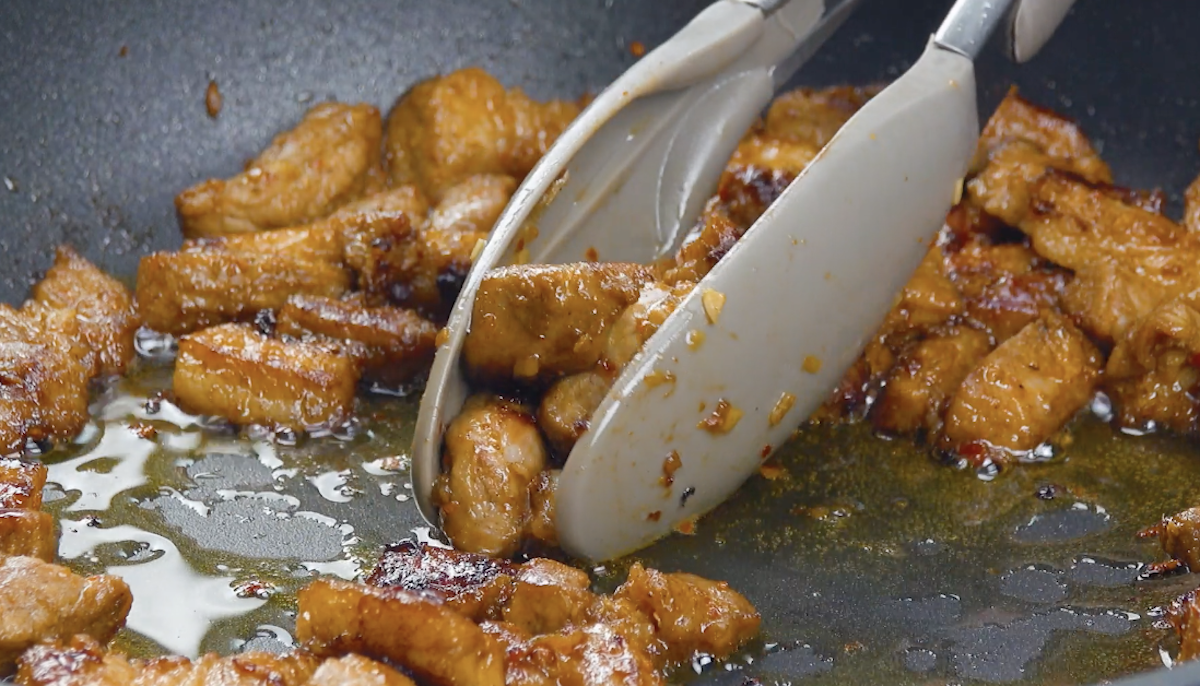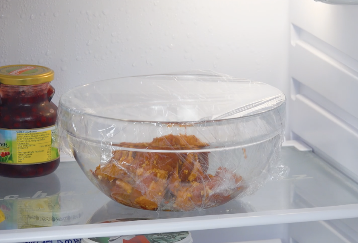 1. Am besten du bereitest am Vortag das Fleisch zu. Schneide den Schweinebauch in Stücke und gib diese in eine Schüssel. Füge Sojasoße, Essig, Chili, Rohrzucker, gemahlenen Koriander, Fünf-Gewürze-Pulver, klein geschnittenen Ingwer und Knoblauch dazu und vermenge alles miteinander. Decke die Schüssel mit Frischhaltefolie ab und stelle sie über Nacht in den Kühlschrank.