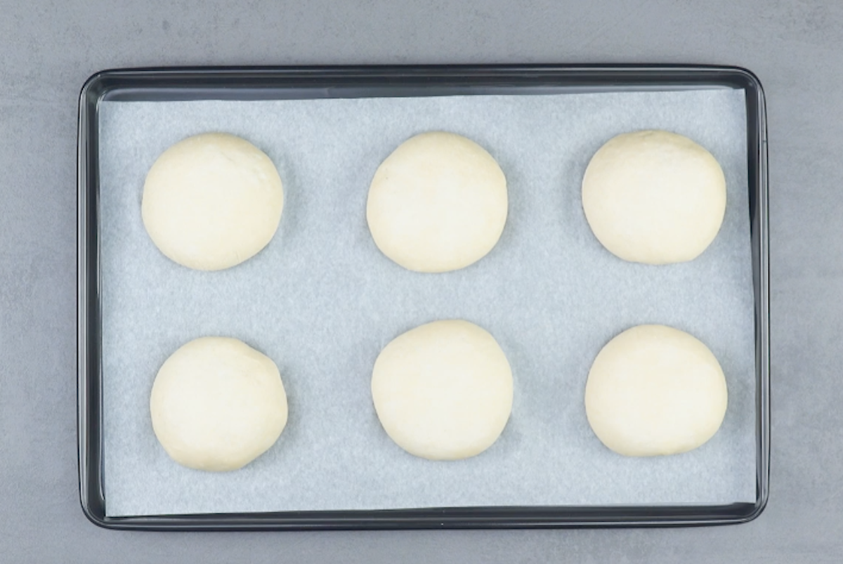 5. Falte nun den Teig zusammen, sodass du eine Kugel in der Hand hältst. Wiederhole alles mit dem restlichen Teig und der restlichen Füllung. Lege die gefüllten Teig-Kugeln mit der „offenen“ Seite nach unten auf ein mit Backpapier ausgelegtes Backblech.