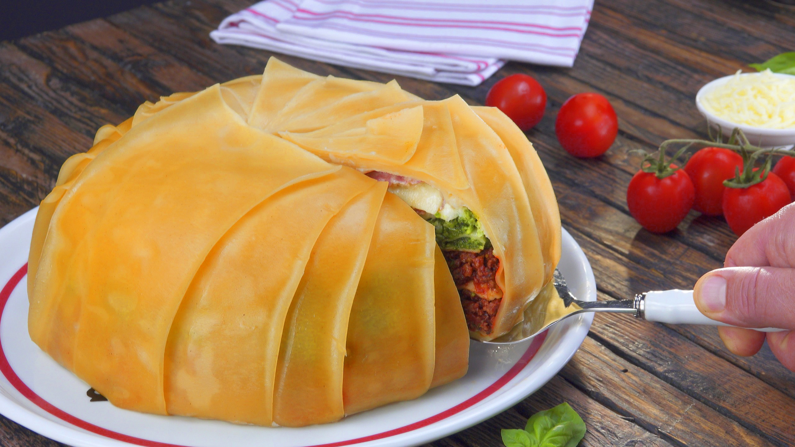 Einige Gerichte sind so schön anzusehen, dass man immer auch ein wenig Schmerz empfindet, wenn sie serviert und verzehrt werden. Doch gleichzeitig macht das ihren Reiz aus, denn wie ein wunderschön verpacktes Geschenk sind sie zwar hübsch anzusehen, aber eigentlich will man so schnell wie möglich an den Inhalt. Dieser Effekt bleibt auch beim Lasagnekuchen nicht aus.