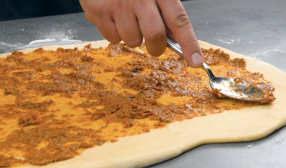 3. Forme den Teig auf einer bemehlten Arbeitsfläche zu einer Kugel und rolle diese dann auf ca. 50 x 40 cm aus. Bestreiche den Teig mit 3 EL des Pestos. An einer Seite sollte ein Rand von 4 bis 5 cm frei bleiben.