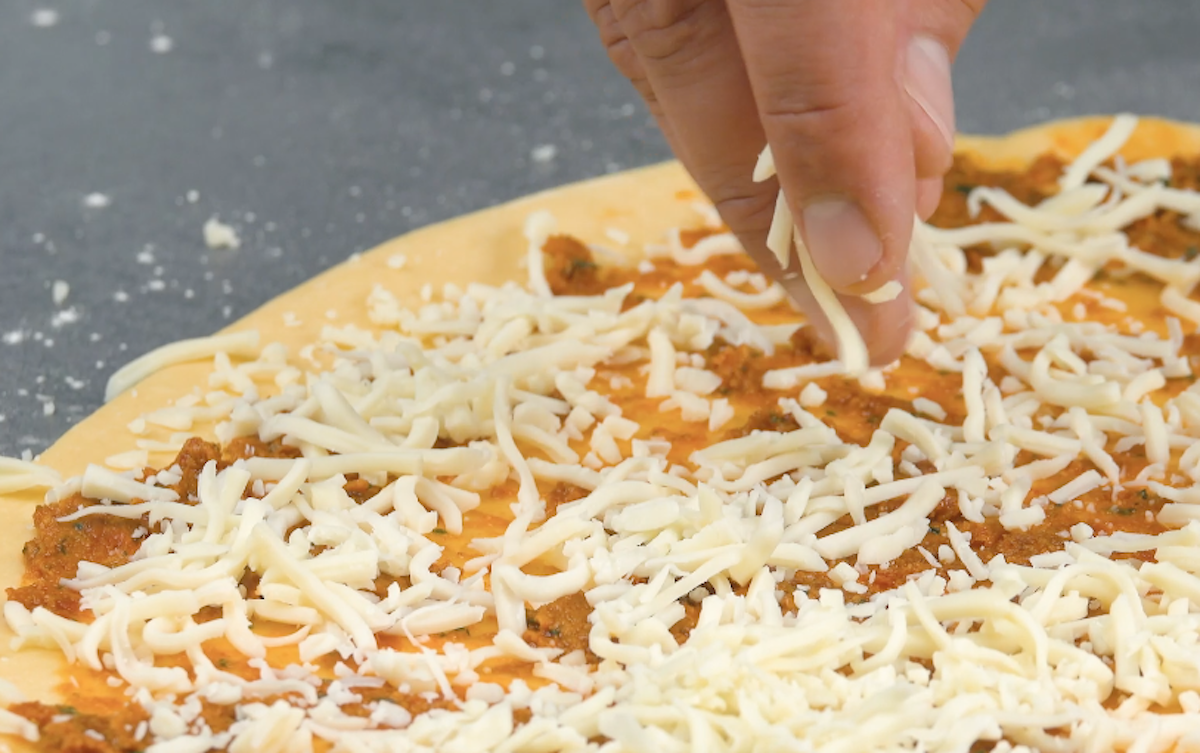 4. Verteile den geriebenen Käse auf dem Pesto.