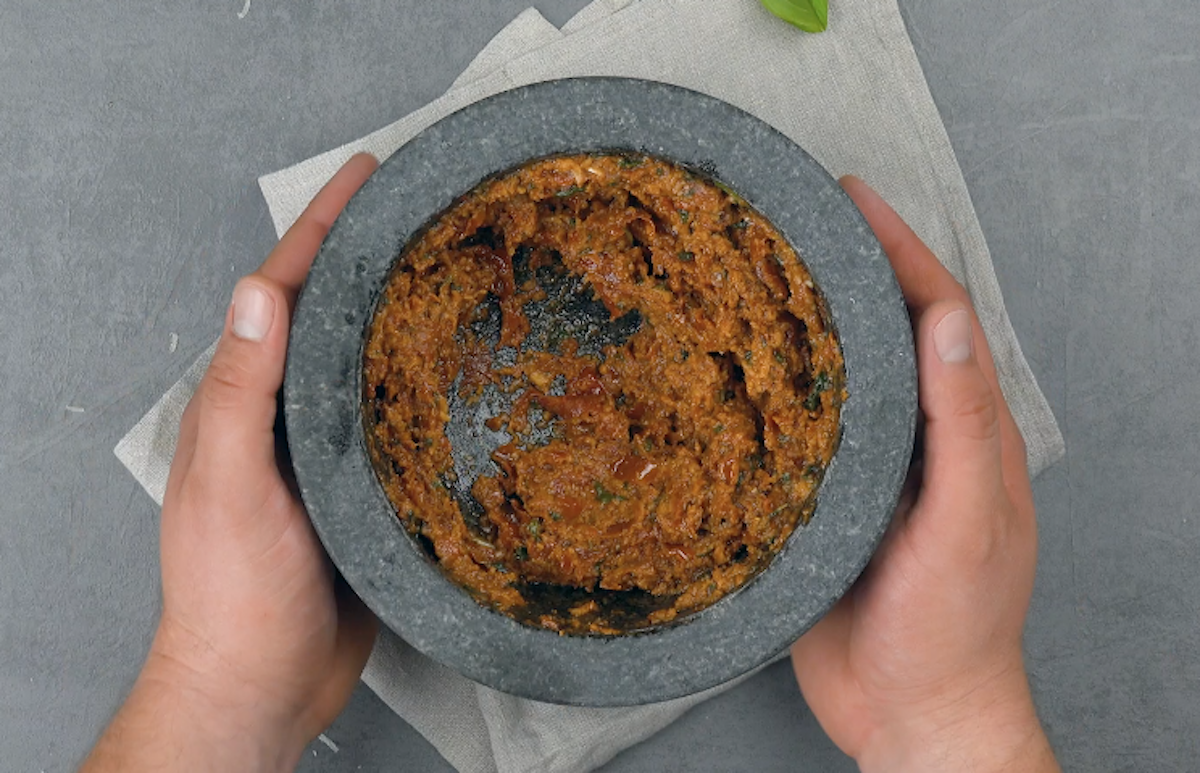 2. In der Zwischenzeit kannst du das Pesto zubereiten. Entweder, du gibst alle Zutaten in einen Mixer, oder, noch besser, du benutzt bei der Herstellung einen Mörser.