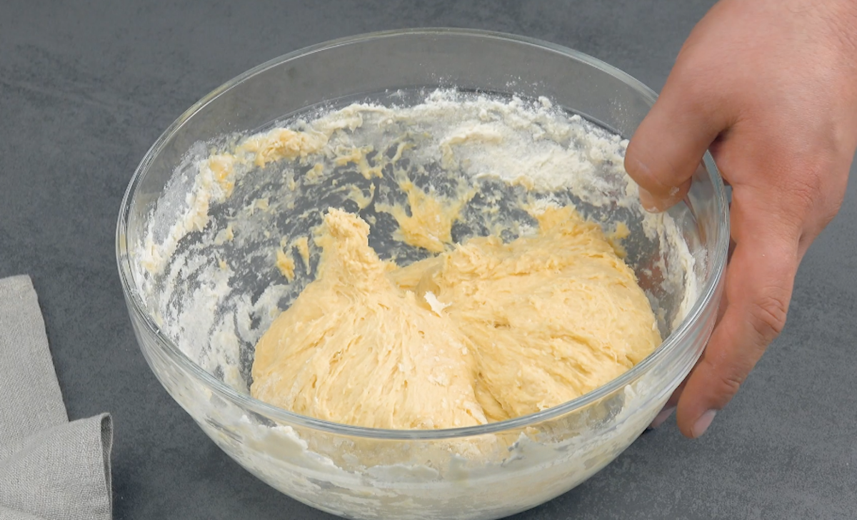 1. Gib Mehl, Butter, Eier, Salz und Milch in eine Schüssel. Vermenge dann die Hefe mit Wasser und Zucker in einem anderen Gefäß und gib das Gemisch zum Rest hinzu. Verrühre alles mit einem Handrührgerät zu einem glatten Teig. Decke den Teig ab und lasse ihn an einem warmen Ort für 1 1/2 Stunden gehen.
