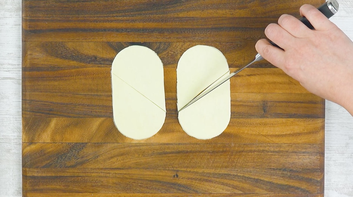 2.2 Entferne den restlichen Blätterteig und schneide die ovalen Teigstücke diagonal ein.