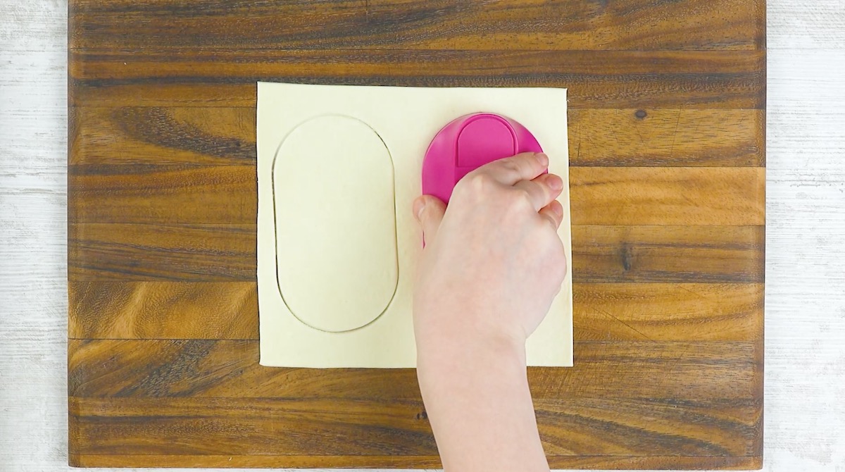 2.1 Rolle den Blätterteig aus und stich mit einem ovalen Deckel zwei Teigstücke aus.