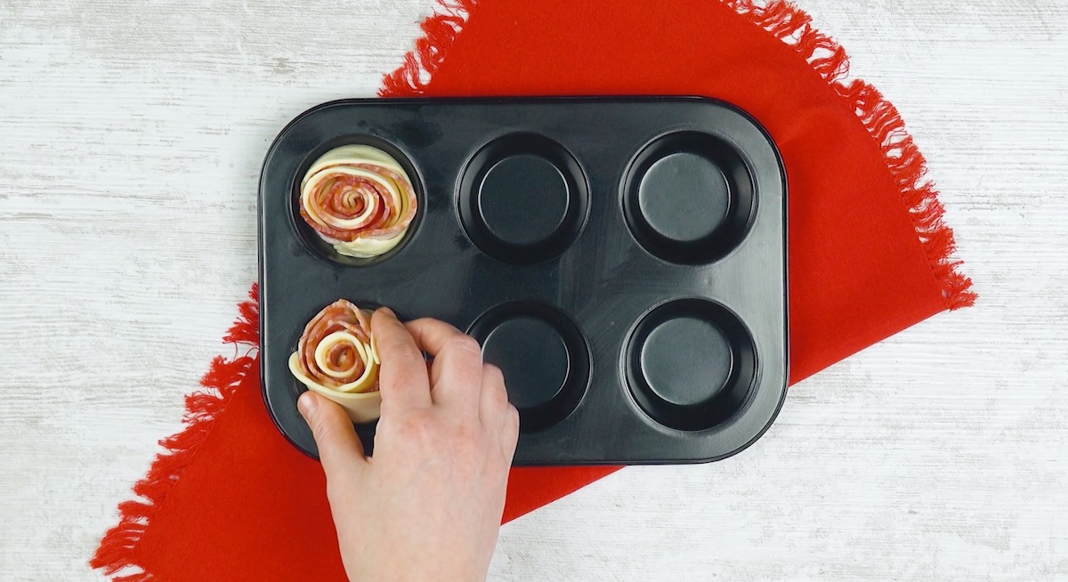3.4 Rolle den Blätterteig-Speck-Streifen nun auf und lege ihn in ein eingefettetes Muffinblech; verfahre auch mit den übrigen Blätterteigstreifen nach diesem Prinzip.