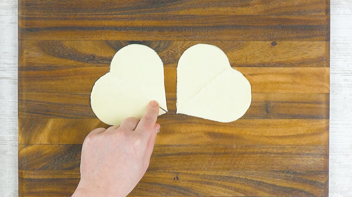 2.3 Drehe von jedem Teigstück eine Hälfte um und lege die Teigstücke zu zwei Herzen zusammen; drücke die Herzen in der Mitte zusammen.