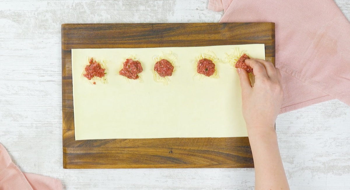 Rolle den Blätterteig aus und lege auf eine Hälfte fünf kleine Häufchen aus geriebenem Käse. Bedecke jedes Käsehäufchen mit etwas Hackfleisch.