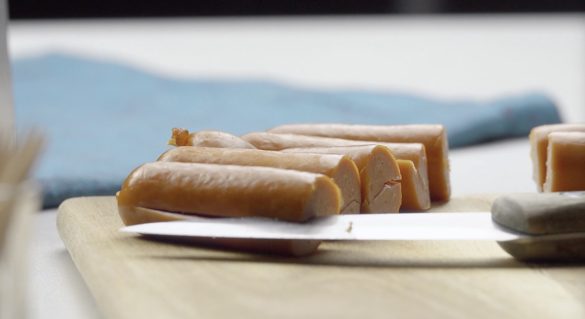 1.) Schneide fünf Wiener Würstchen in der Mitte durch und halbiere sie dann der Länge nach – pass jedoch auf, dass du sie nicht ganz durchschneidest.