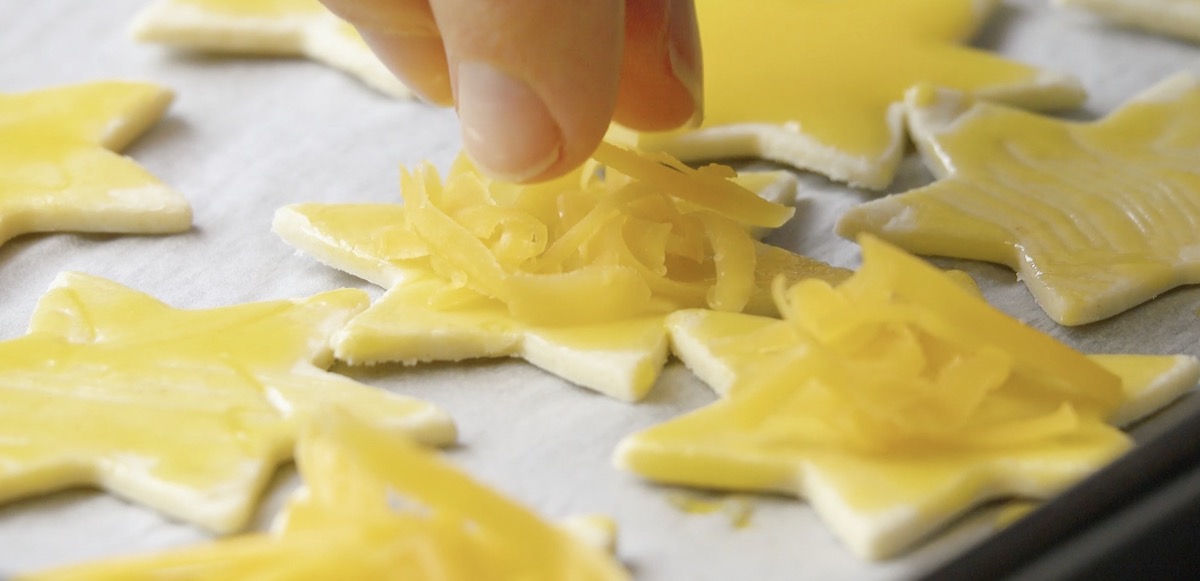 4.) Lege währenddessen einen Blätterteig auf ein Backblech und stich so viele kleine Sterne aus wie möglich. Verquirle ein Ei und bestreiche damit alle Sterne. Garniere dann jeden Stern mit etwas Käse.