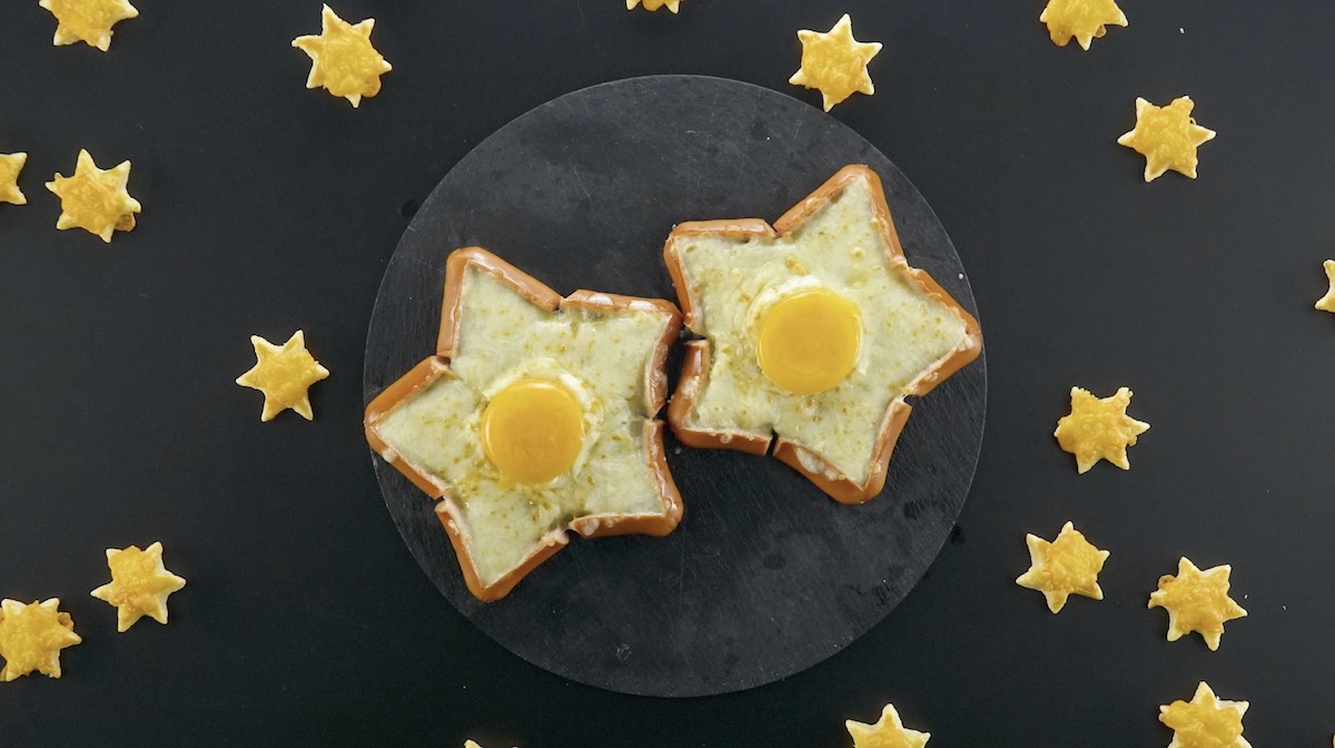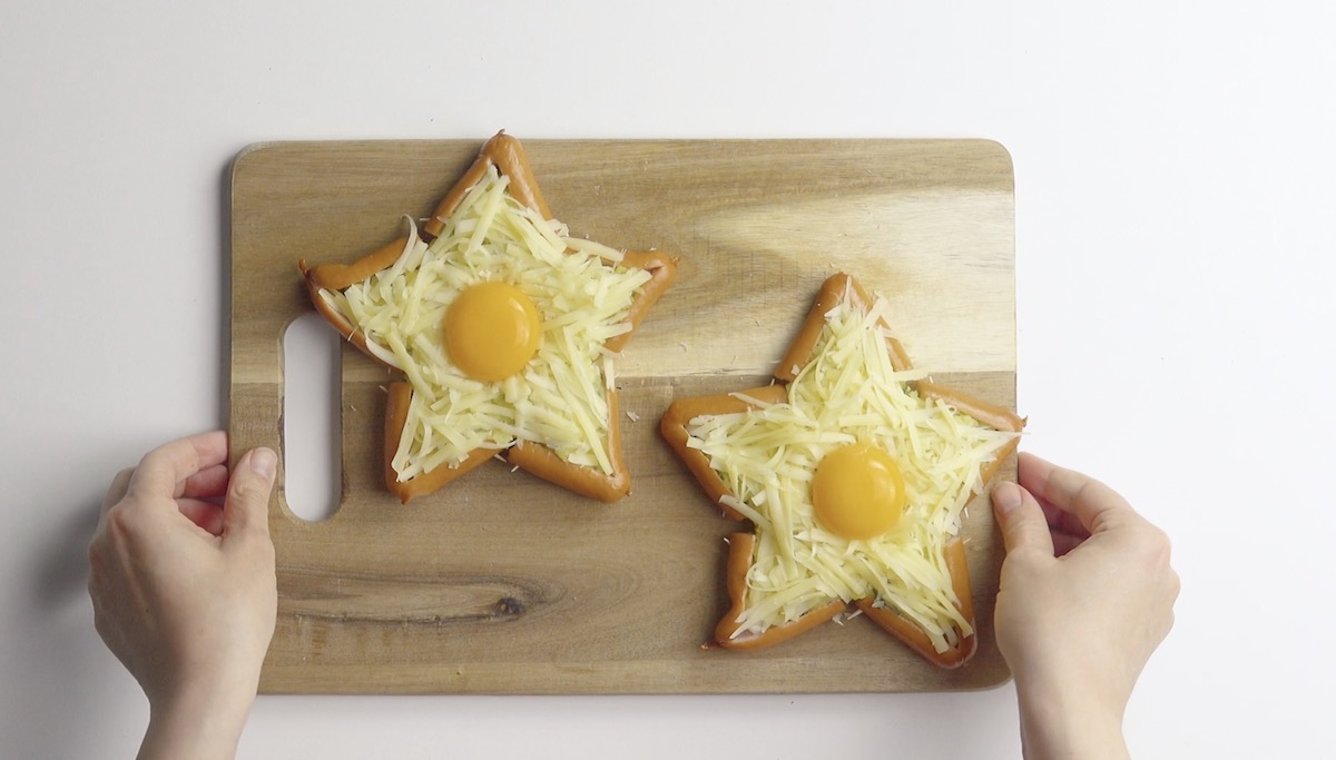 3.) Jetzt kochst du die Kartoffeln, lässt sie etwas abkühlen, schälst sie und stampfst sie mit der Petersilie, dem Eigelb sowie Salz und Pfeffer zusammen. Fülle diesen Kartoffelstampf nun in die Würstchen-Sterne, gib den geriebenen Käse darüber und platziere in die Mitte jedes Sterns ein Eigelb. Backe das Ganze anschließend für zehn Minuten bei 180 °C im Umluft-Modus.