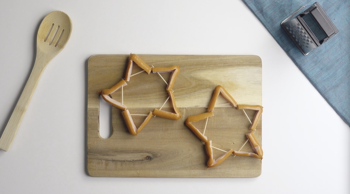 2.) Nimm nun zehn Zahnstocher und stich je einen durch ein halbiertes Wiener Würstchen und „öffne“ es damit vorsichtig. Ordne alle Würstchenhälften dann zu zwei großen Sternen an.